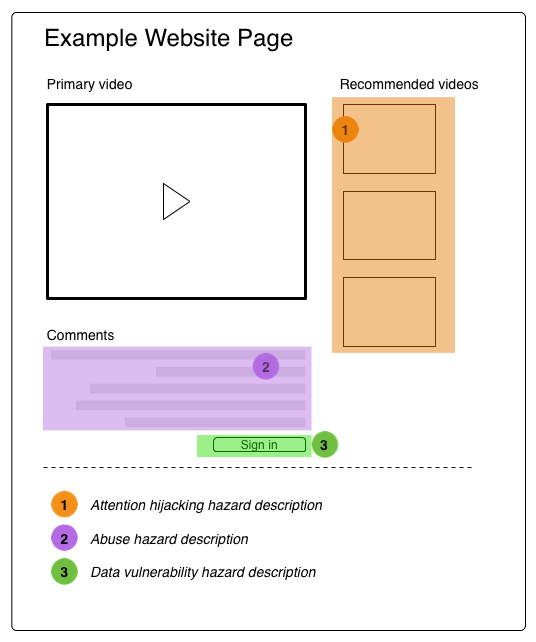 I propose adding an additional overlay on the information architecture and UX documentation: hazard mapping. Borrowed from the field of risk management with common applications in occupational safety and disaster prevention, a hazard map highlights areas affected by or vulnerable to a particular hazard.